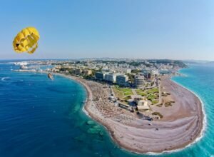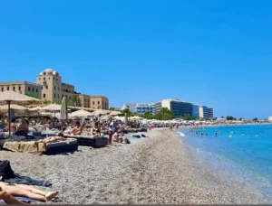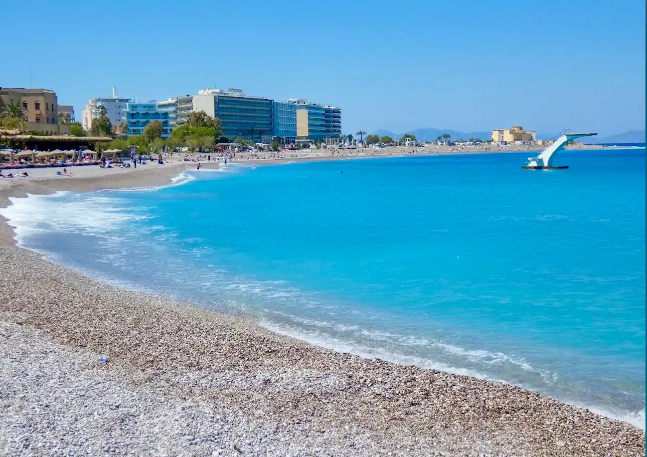 The stretch of beach from the Aquarium (tip of the island) to the Elli beach bar is known as Enidrio (Aquarium) or Elli beach among locals. This beach is the most famous beach in the center of Rhodes, and it’s easy to see why. With deep, cool, and crystal-clear waters, this beach is in the heart of the city, just a stone's throw from the Medieval Town of Rhodes. The colorful umbrellas, beach bars, restaurants, towering hotels, Casino of Rodos, and the Rhodes Aquarium create a picturesque scene that has become iconic, often featured on cult postcards.