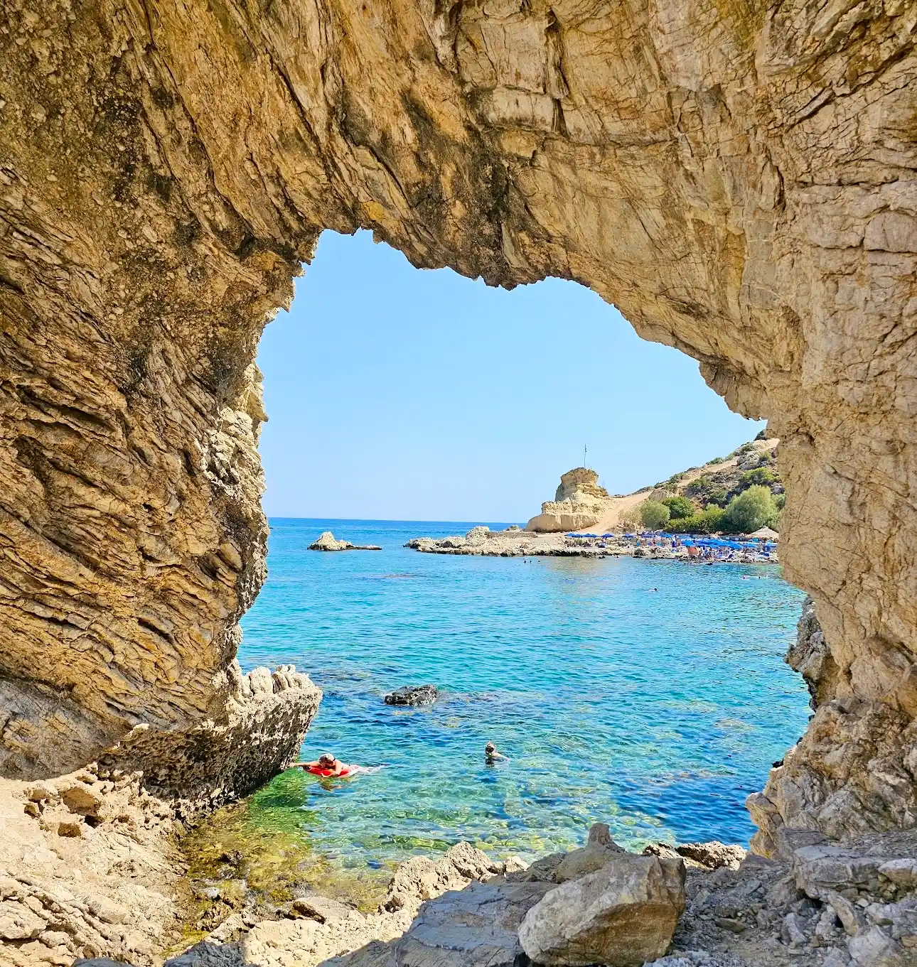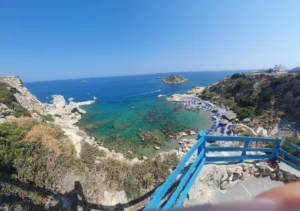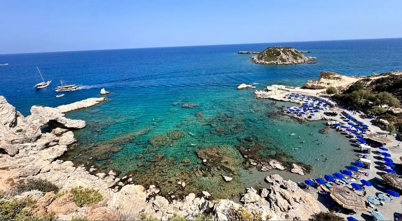 Grande Blue Beach is a must-visit gem on Rhodes, perfect for those who love stunning scenery and crystal-clear waters. To reach this small paradise, you’ll need to pass by Stegna Beach