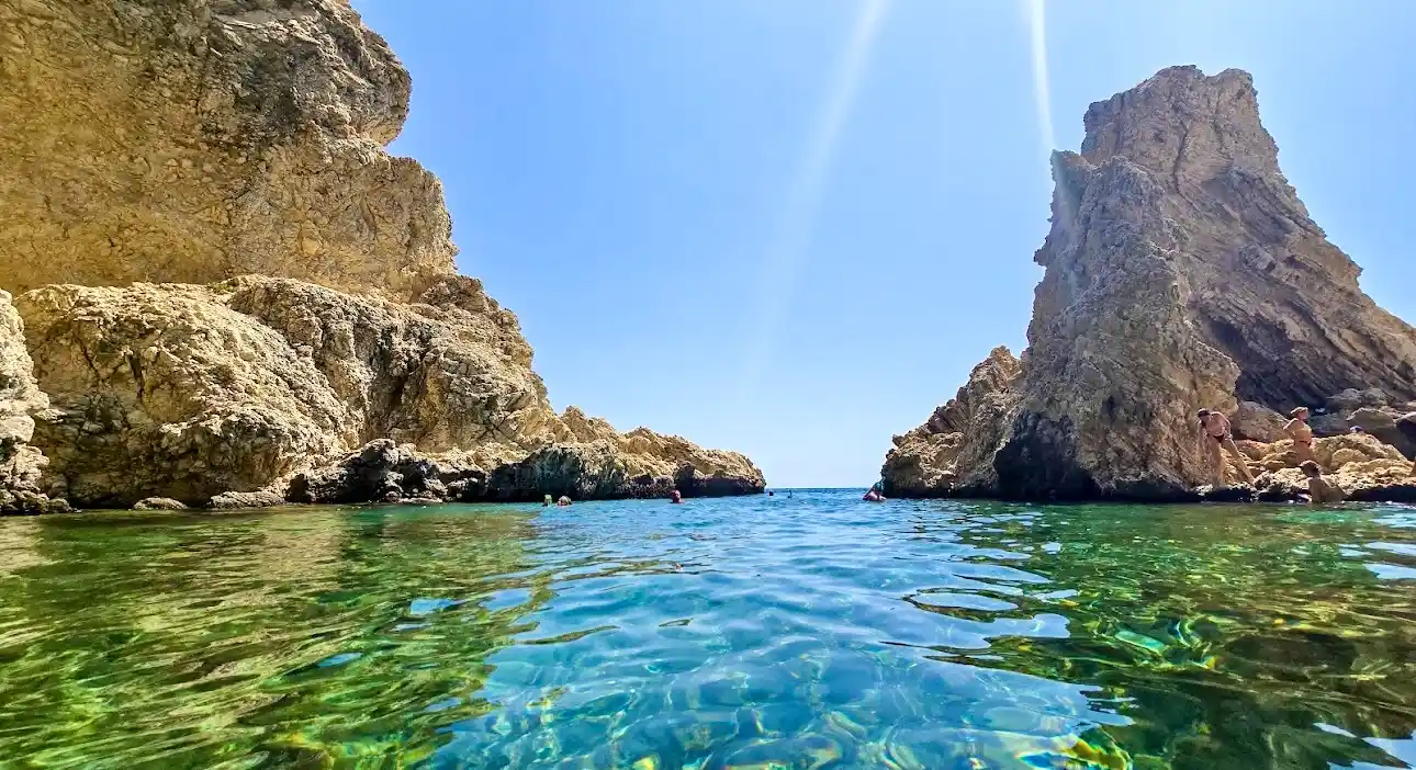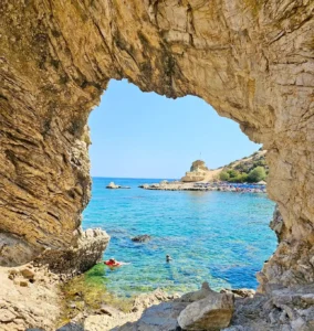 The beach offers immaculate waters that are ideal for swimming and relaxing. The area is well-organized and always kept clean, with a good beach bar offering great prices and quality products. To the left of the main beach, you’ll find a charming private beach and a magical cave. The cave is a special attraction, but be cautious as the path to it is rocky.