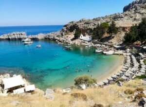 Lindos Beach is always buzzing with life, with its clear waters and plenty of sunbeds where you can just kick back and soak up the sun. There’s a lively vibe, and all around the beach, you’ll find cozy tavernas and cafes where you can enjoy delicious local food. Right above the beach, the Lindos Acropolis sits proudly, offering a view that’ll take your breath away. The ancient ruins are full of history, and the climb up to the top is totally worth it for the stunning views of the island. It’s one of those must-see spots.