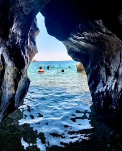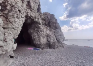 However, what truly steals the show are the nearby caves. The large, stunning rocks create a magical landscape. This beach is a favorite among locals for evening swims and celebrations like birthdays, and you'll often find groups of people enjoying the space.